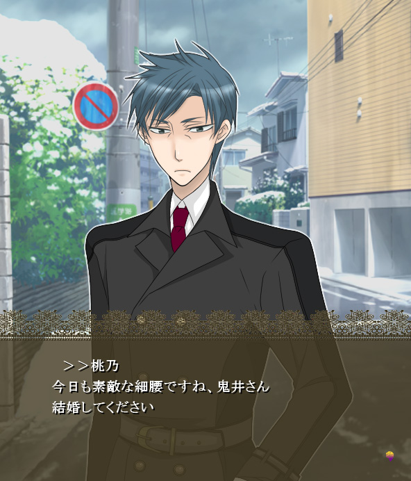 細い腰のオジサマ・鬼井さん(スクリーンショットの立ち絵のキャラです)にタッチするゲームで、1プレイは5分もかかりません。フルコンプまではだいたい20分くらいでした。